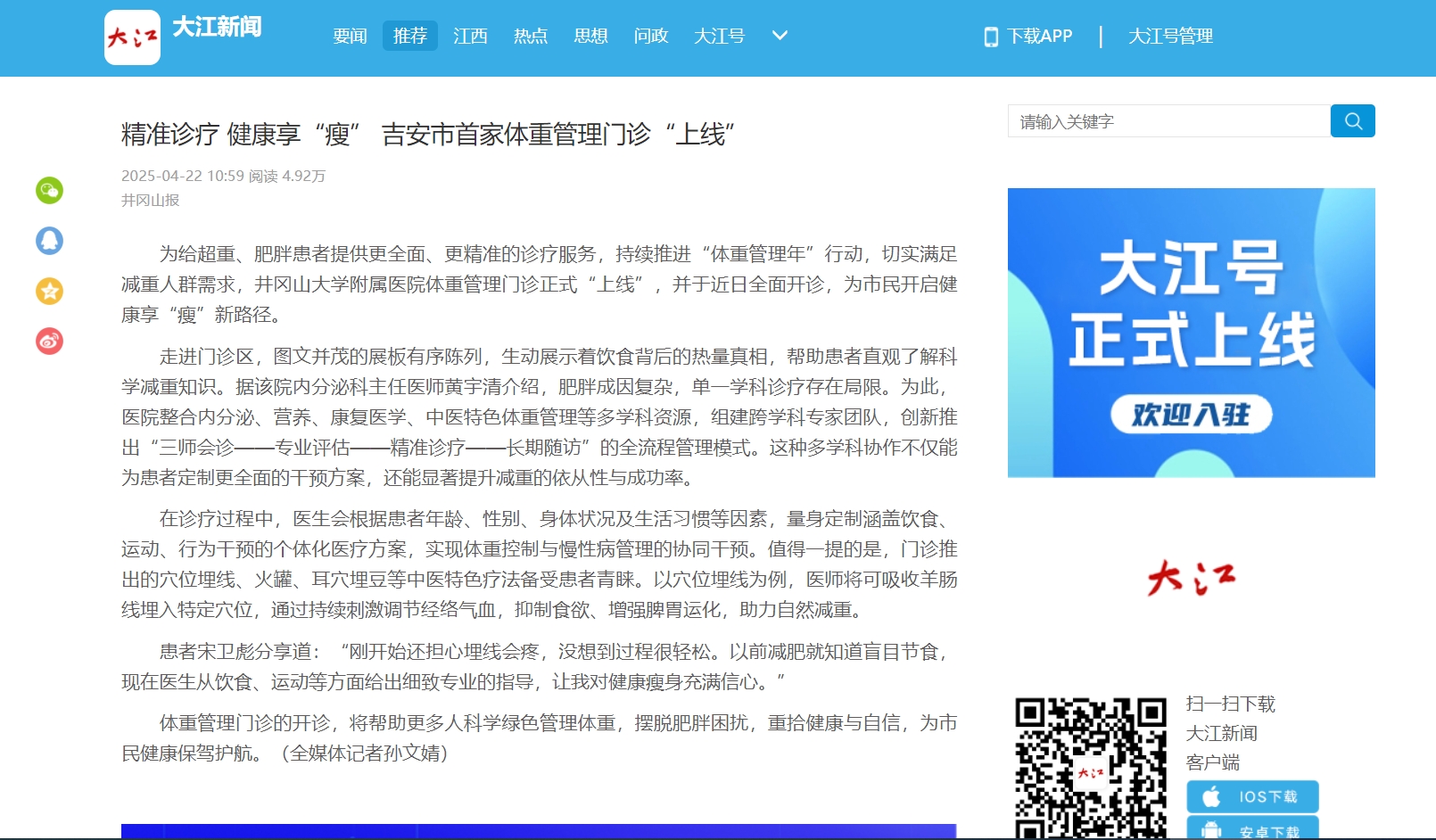 【井冈山报】精准诊疗 健康享“瘦” 吉安市首家体重管理门诊“上线”